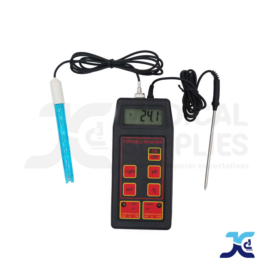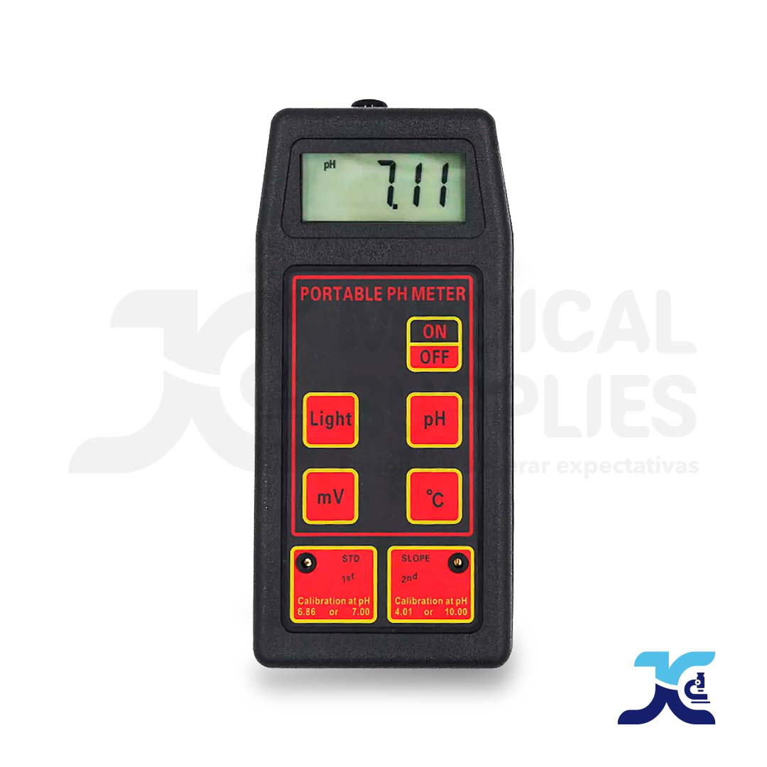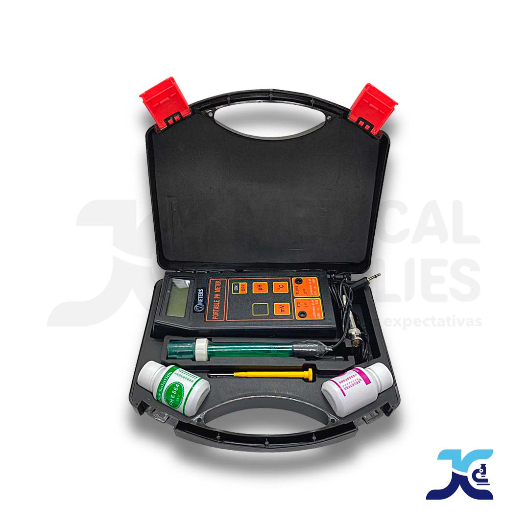 Medidor de pH portátil de alta precisión. Ideal para educación y mediciones en campo. Fácil calibración de pH que se puede realizar de forma manual. La pantalla del panel frontal muestra la temperatura o el pH o lectura en mV tomada por el instrumento con un electrodo de pH y un electrodo de temperatura. El teclado Hande para la selección de las diferentes funciones, la posibilidad de corregir automáticamente los errores en la medición. Es aplicable para determinar pH de soluciones acuosas en centros de investigación, centros de salud, centros educativos, piscinas o fábricas.
